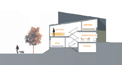 Selve ankomstvejen og de dermed tilstødende gårdrum følger det eksisterende terræn. Dette naturlige terrænspring udnyttes i den enkelte bolig til en forskydning af niveauerne internt i det enkelte hus som et ”split-level”.